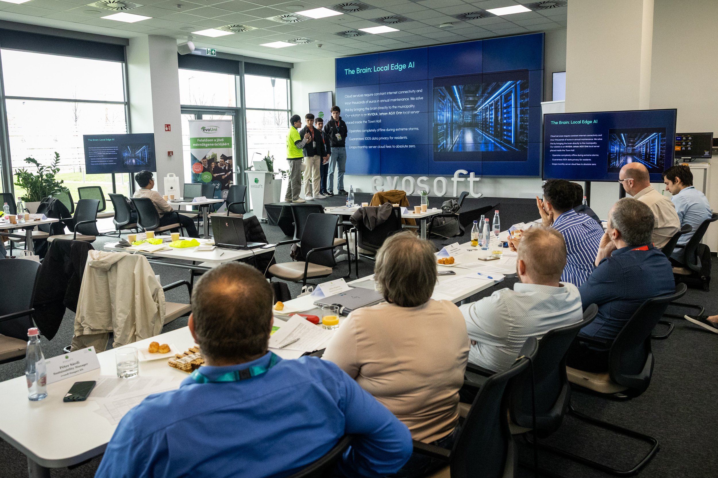 The second day β the Grand Finale β took place at evosoftβs Budapest headquarters, where finalists presented their solutions. The jury, consisting of the same industry and academic experts who assessed the online round, provided detailed engineering feedback and highlighted the proposals with longβterm sustainability and real implementation potential.