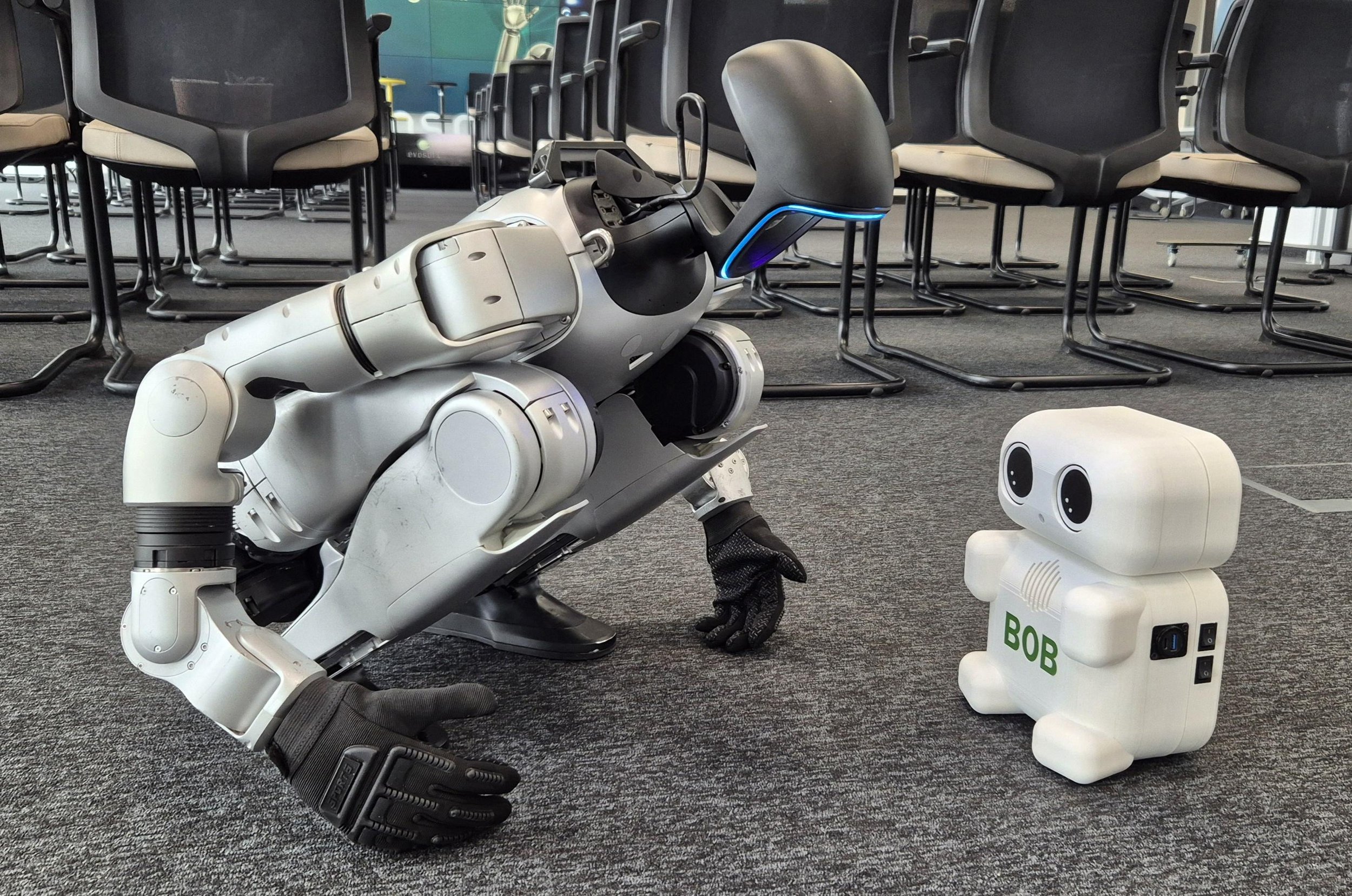 Flattering Bob happily complimented the humanoid robot visitor, who replied with heart emojis and the two new tech friends wandered off into the metaphorical sunset of the evosoft HQ.