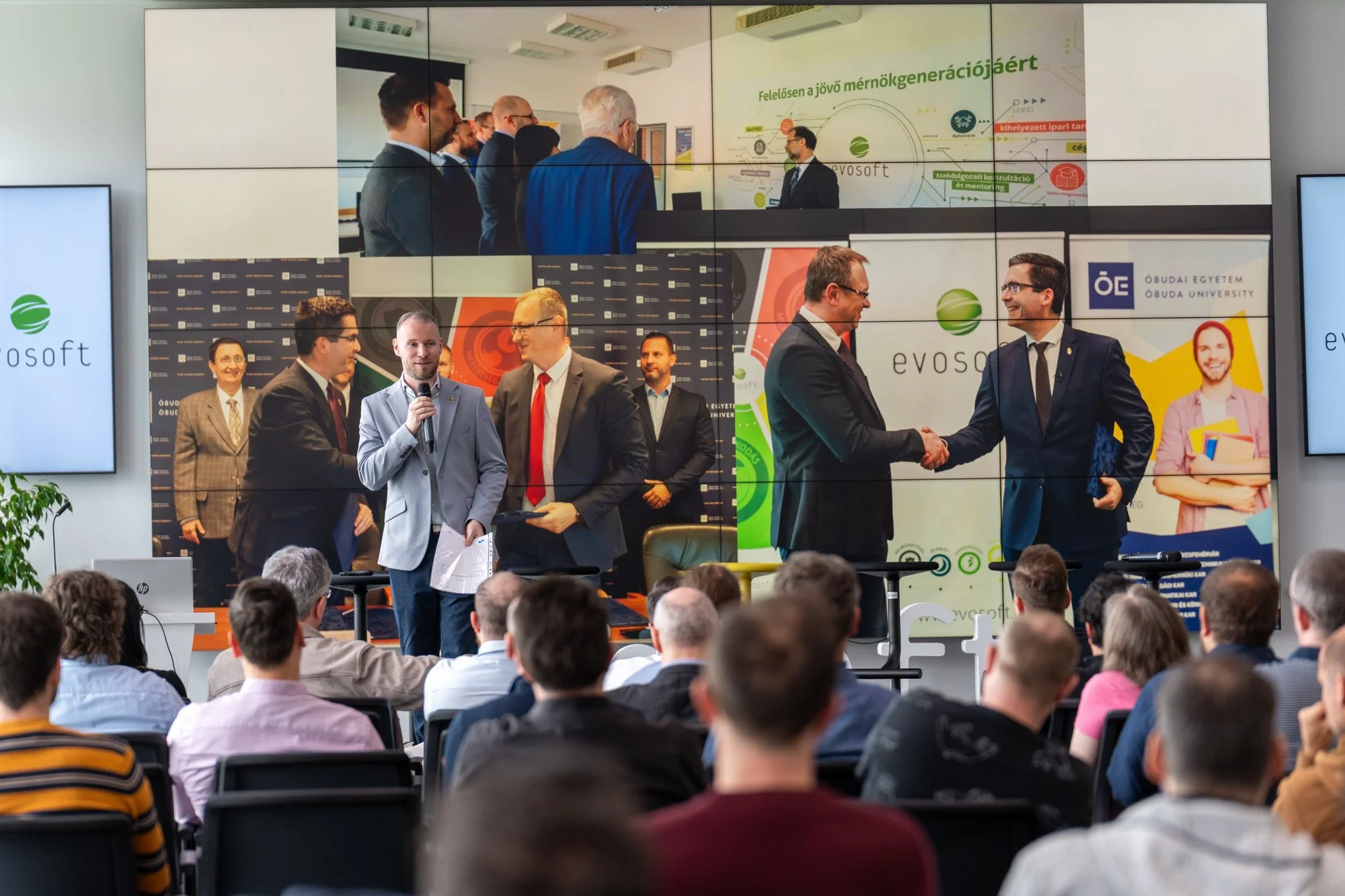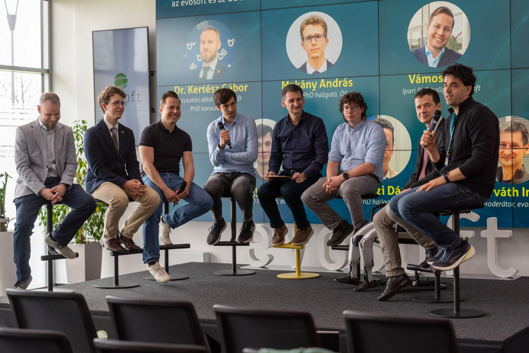 evosoftβs PhD colleagues, AzΓ‘r VΓ‘mos, DΓ‘niel Ferenczi, DΓ‘niel Nagy, GΓ‘bor Sterczl β along with two external guests, shared what they work on, why they chose the PhD path, and how they balance industrial work with academic research.