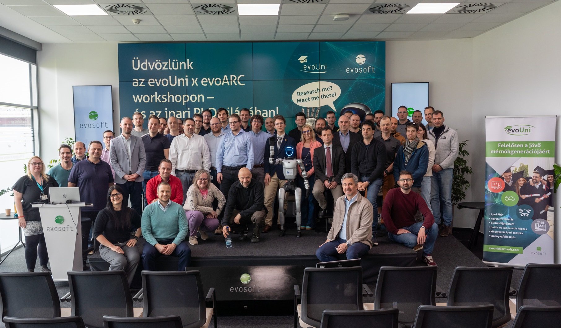 On March 26, the Multivibrator Room once again turned into a buzzing space full of research, technology and handsβon innovation. This yearβs evoUni Γ evoARC workshop brought robotics, AI and industrial research together, and for the first time ever, the spotlight was shared by two robots: the Unitree humanoid robot from Γbuda Universityβs Bejczy Antal Robotics Center, and evosoftβs own Flattering Bob.